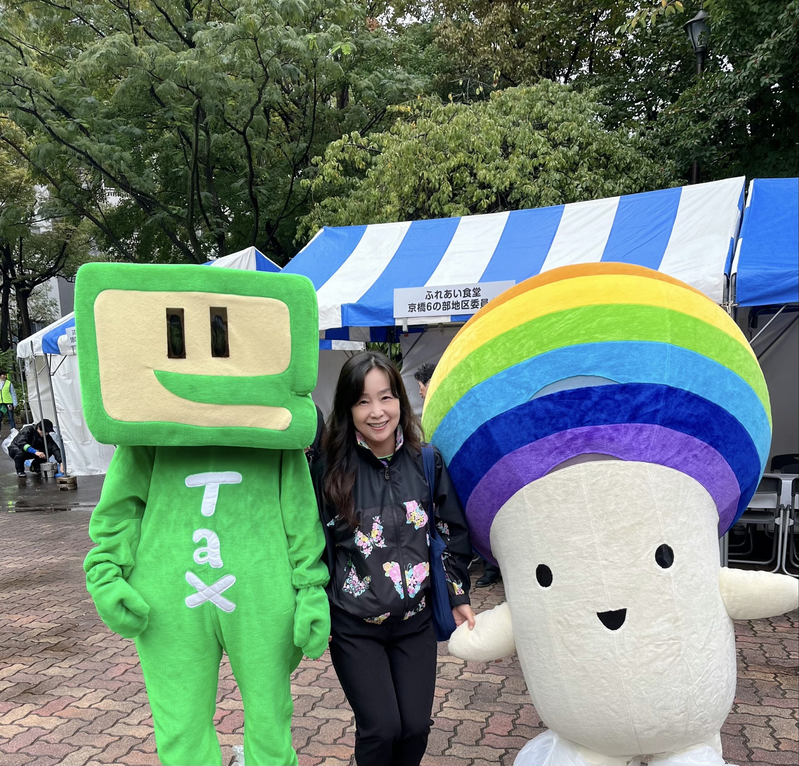 ゆるキャラの「イータ君」「ニジノコ」に挟まれたわたし